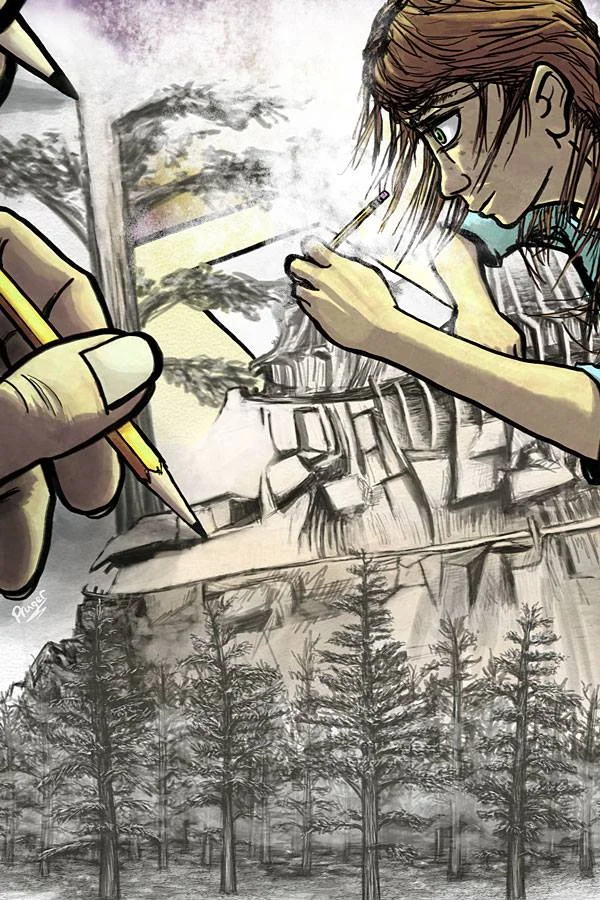 Before, especially, with the comics and prose I would make, every story was about the intense pressure of the character's world collapsing around them, as horrible things happened, with few solutions but to try and escape to something less ruined. They were stories about being hurt and damaged, about endings, and claustrophobic struggle.